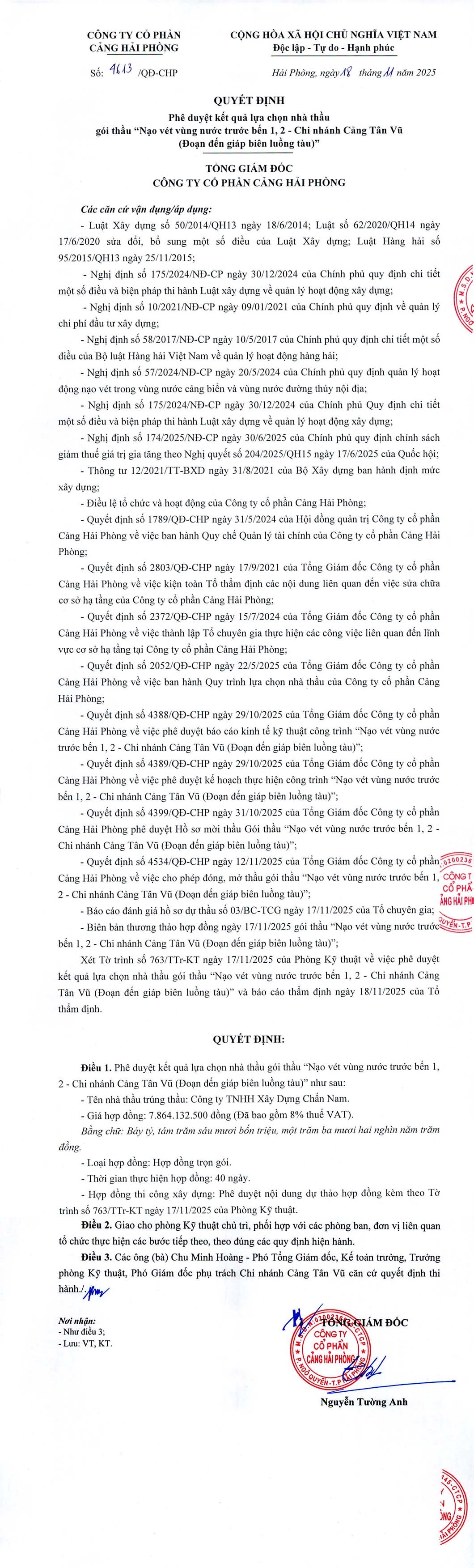 19/11/2025 Kết quả lựa chọn nhà thầu gói thầu "Nạo vét vùng nước trước bến số 1,2 - CN Cảng Tân Vũ (Đoạn tiếp giáp biên luồng tàu) Xem thêm