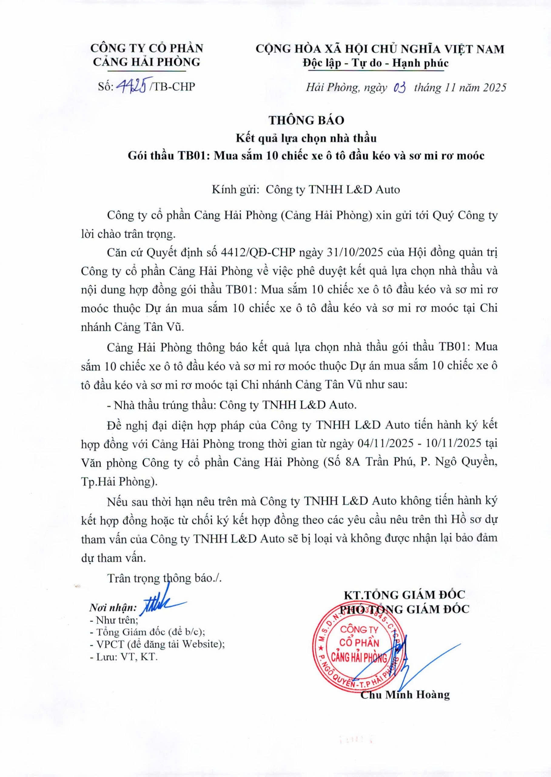 05/11/2025 Thông báo kết quả lựa chọn nhà thầu Gói thầu TB01: Mua sắm 10 chiếc xe ô tô đầu kéo và sơ mi rơ moóc Xem thêm