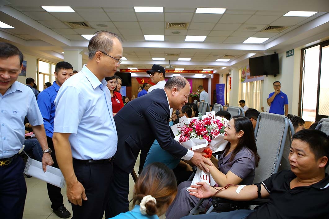 Đồng chí Bùi Mạnh Phúc – Phó Ban Thường trực Ban Chỉ đạo vận động hiến máu tình nguyện thành phố, Chủ tịch Hội Chữ thập đỏ thành phố Hải Phòng tặng hoa, ghi nhận và biểu dương những đóng góp tích cực của Cảng Hải Phòng đối với phong trào hiến máu nhân đạo của thành phố trong nhiều năm qua.