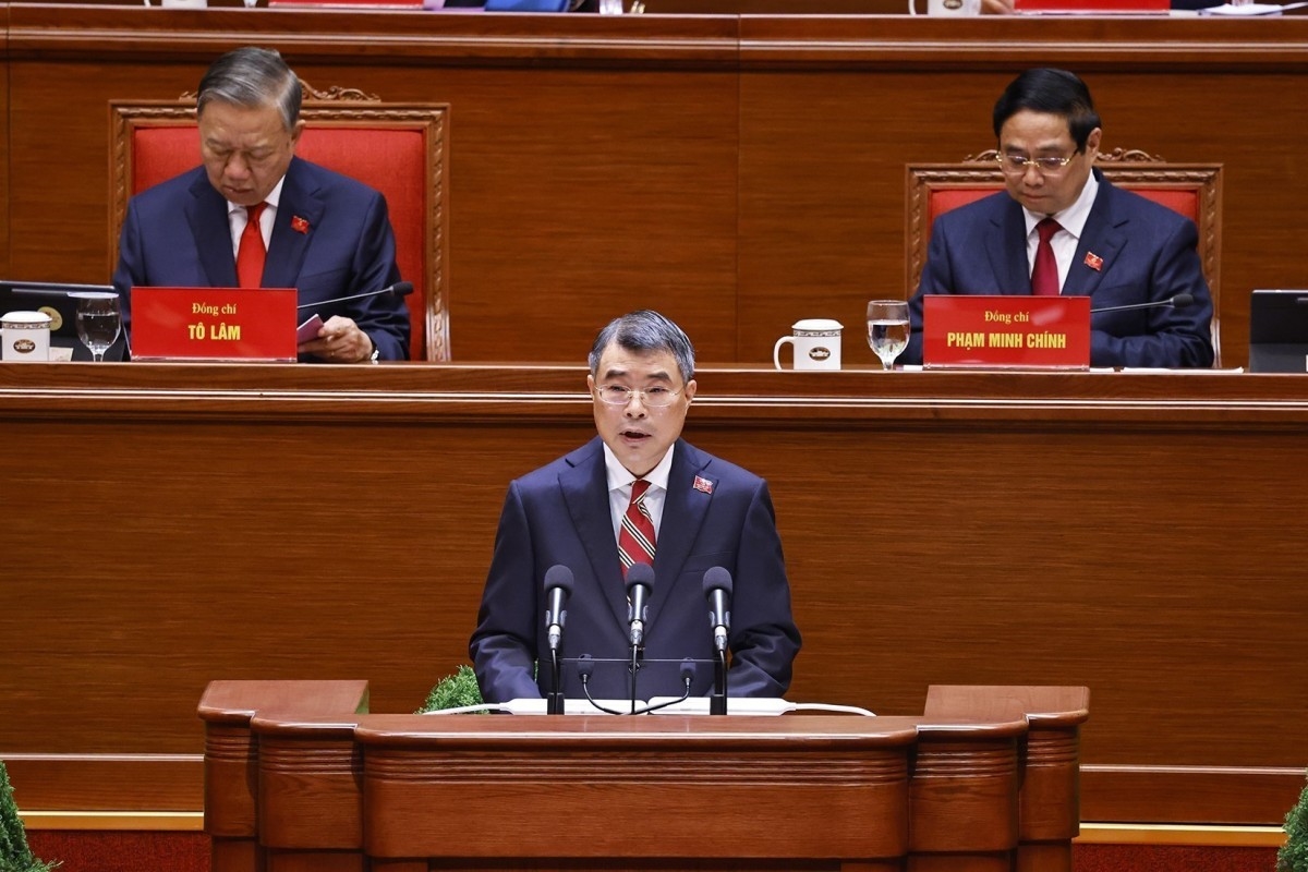 Đồng chí Lê Minh Hưng, Ủy viên Bộ Chính trị, Bí thư Trung ương Đảng, Trưởng Ban Tổ chức Trung ương thay mặt Đoàn Chủ tịch trình bày Báo cáo của Ban Chấp hành Trung ương Đảng khóa XIII về công tác nhân sự Ban Chấp hành Trung ương Đảng khóa XIV