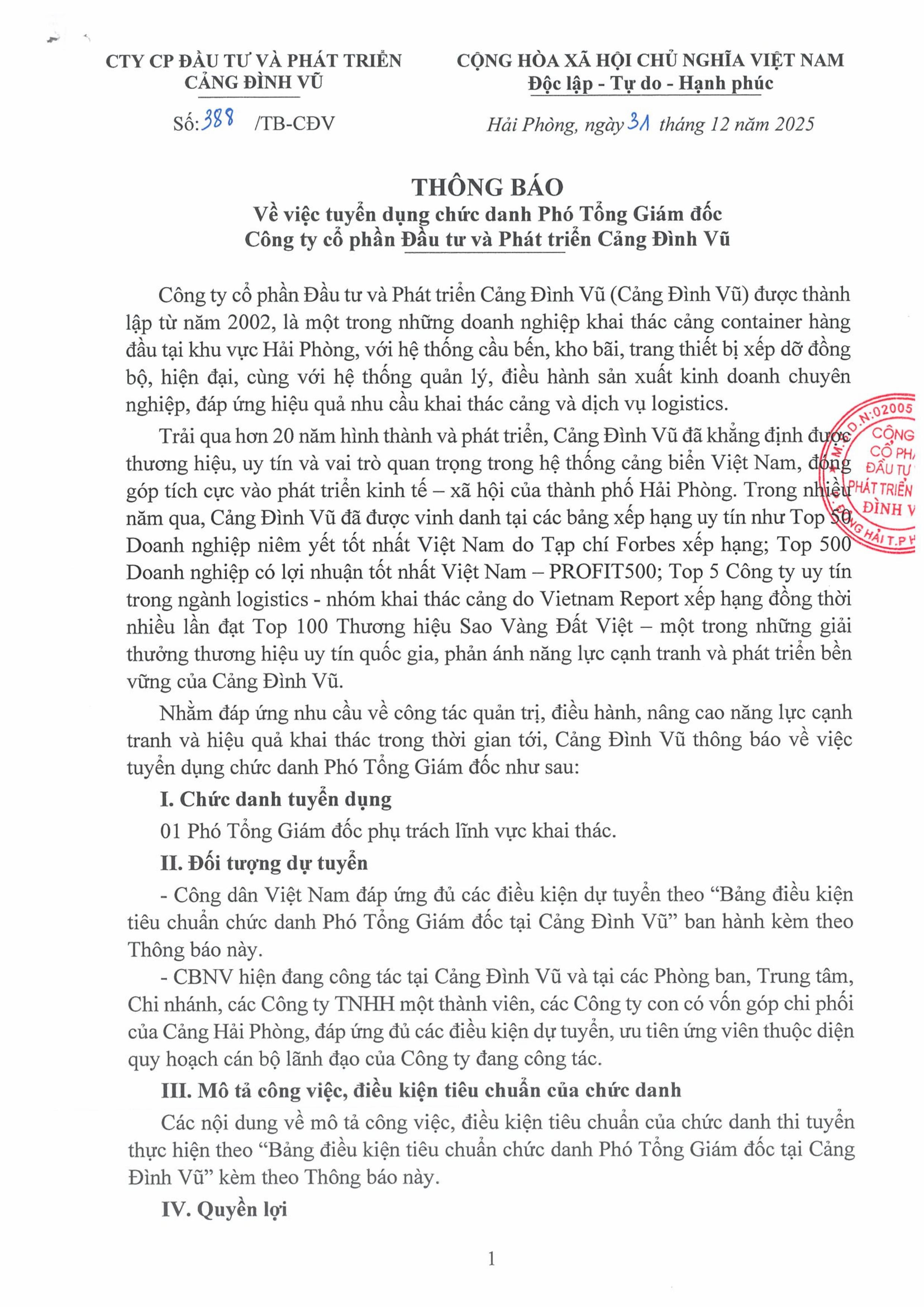 02/01/2026 Thông báo về việc tuyển dụng chức danh Phó Tổng Giám đốc Công ty CP Đầu tư và Phát triển Cảng Đình Vũ Điều kiện ứng tuyển, tiêu chuẩn chức danh và hồ sơ đăng ký xem thêm tại đây Xem thêm