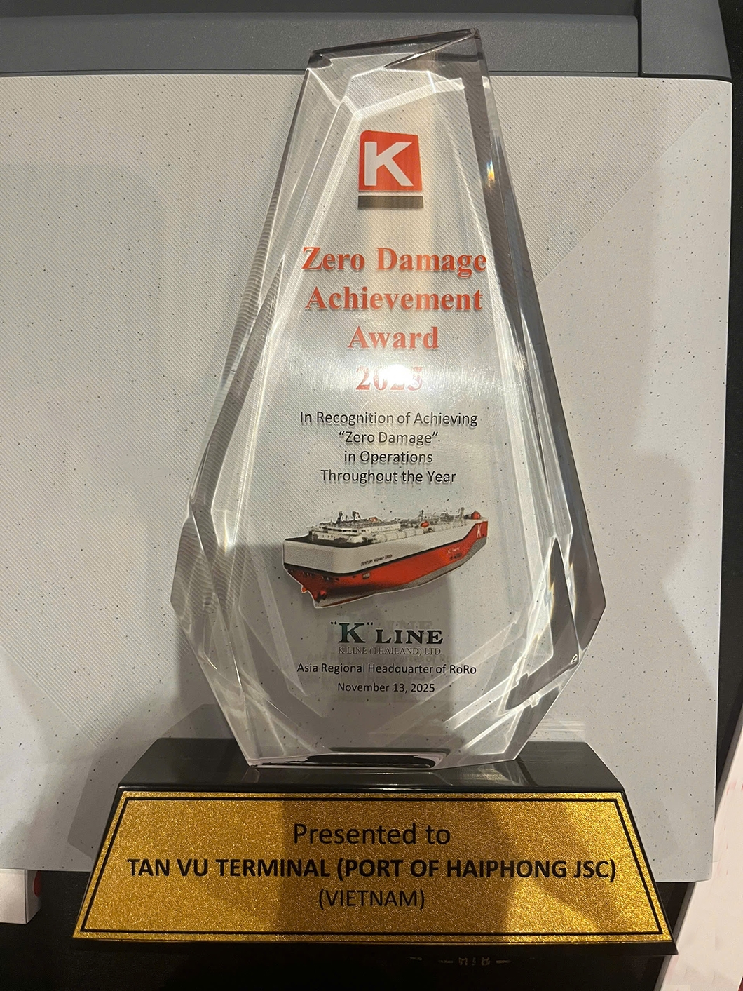 On November 13, 2025, at the Asia Regional Loss Prevention Conference 2025, Tan Vu Terminal Branch (under Port of Hai Phong Joint Stock Company) was honored to receive the receive the "Zero Damage 2025" certificate from KLine shipping company, recognizing its outstanding achievements in RORO vessel operations and ensuring absolute safety for cargo.