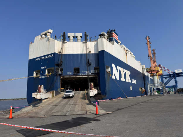 Tàu RORO của hãng NYK mang tên Procyon Leader xếp dỡ hàng ô tô tại cầu 5 tại chi nhánh Cảng Tân Vũ